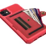 Dette røde iPhone 11 mobilcover af PU læder er samtidig designet så smart, at du kan bruge det som et støttestativ, ligesom der følger en elastisk fingerrem med, som gøre, at du altid har din telefon sikkert i hånden.