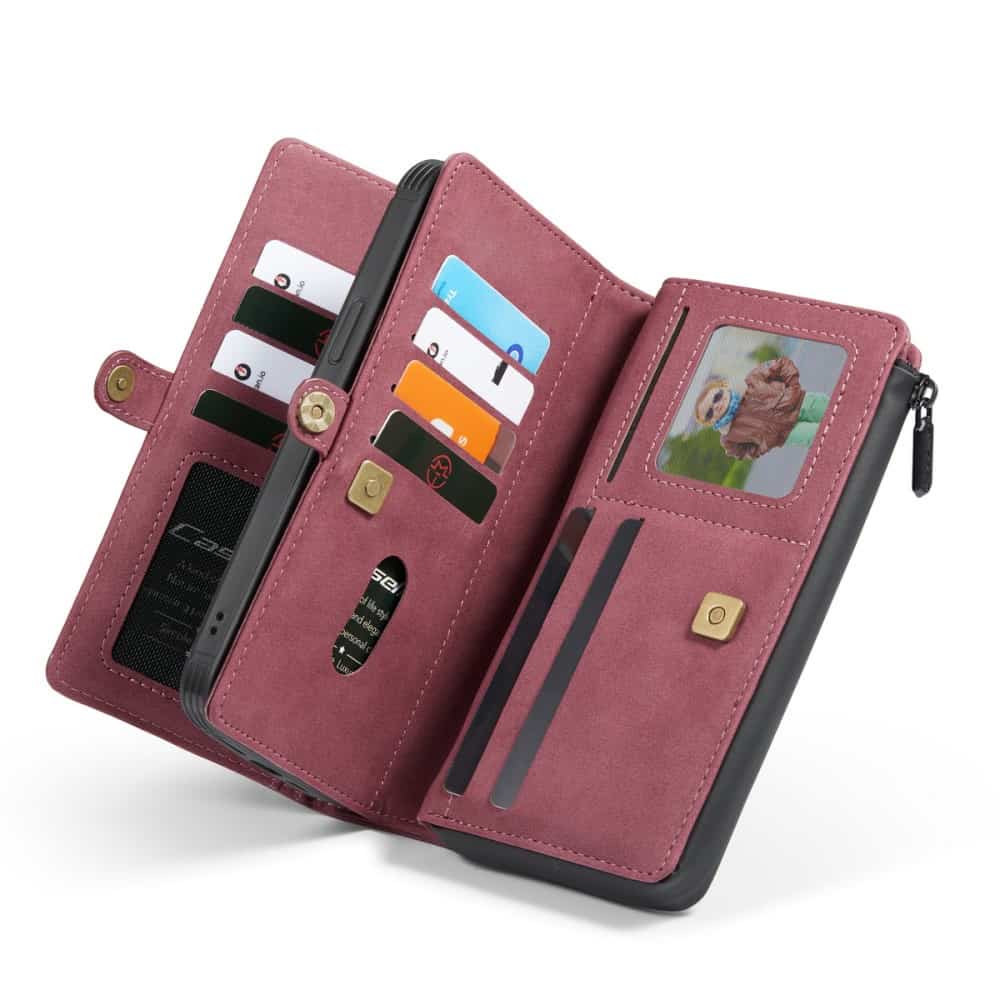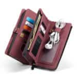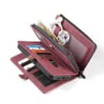 Forrest på coveret er der en kortholder med plads til 5 kort og to lommer til kontanter. På bagsiden er der en klassisk pung med lynlås og en side med plads til 7 kort samt et billede. I lynlåsrummet er der plads til 5 kort, et stort rum til sedler og en strop til at holde styr på fx dit headset.