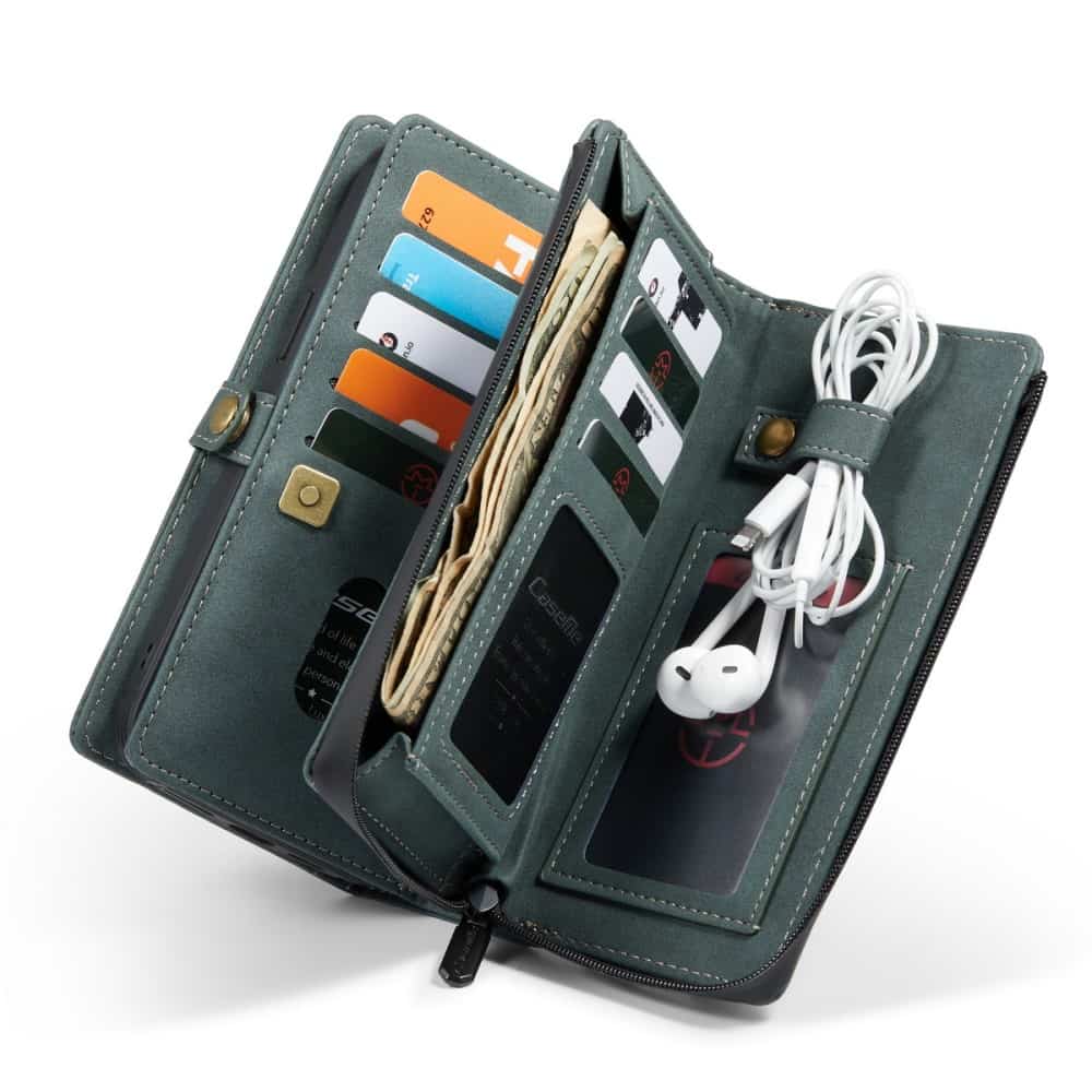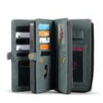 Forrest på coveret er der en kortholder med plads til 5 kort og to lommer til kontanter. På bagsiden er der en klassisk pung med lynlås og en side med plads til 7 kort samt et billede. I lynlåsrummet er der plads til 5 kort, et stort rum til sedler og en strop til at holde styr på fx dit headset.