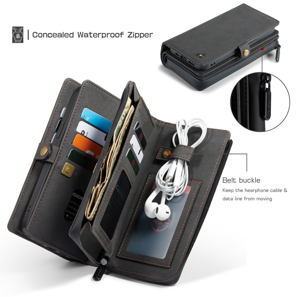 Forrest på coveret er der en kortholder med plads til 5 kort og to lommer til kontanter. På bagsiden er der en klassisk pung med lynlås og en side med plads til 7 kort samt et billede. I lynlåsrummet er der plads til 5 kort, et stort rum til sedler og en strop til at holde styr på fx dit headset.