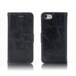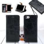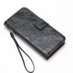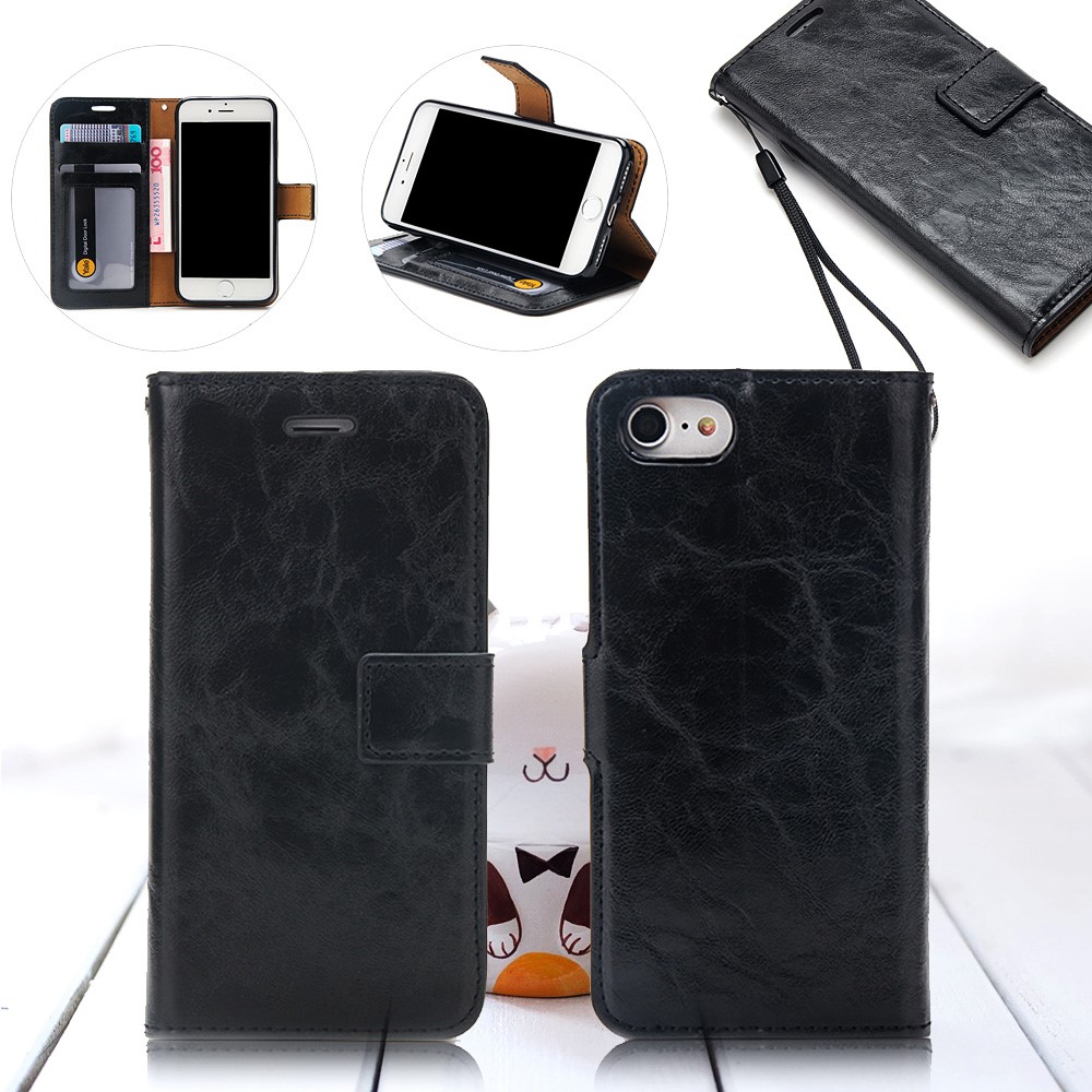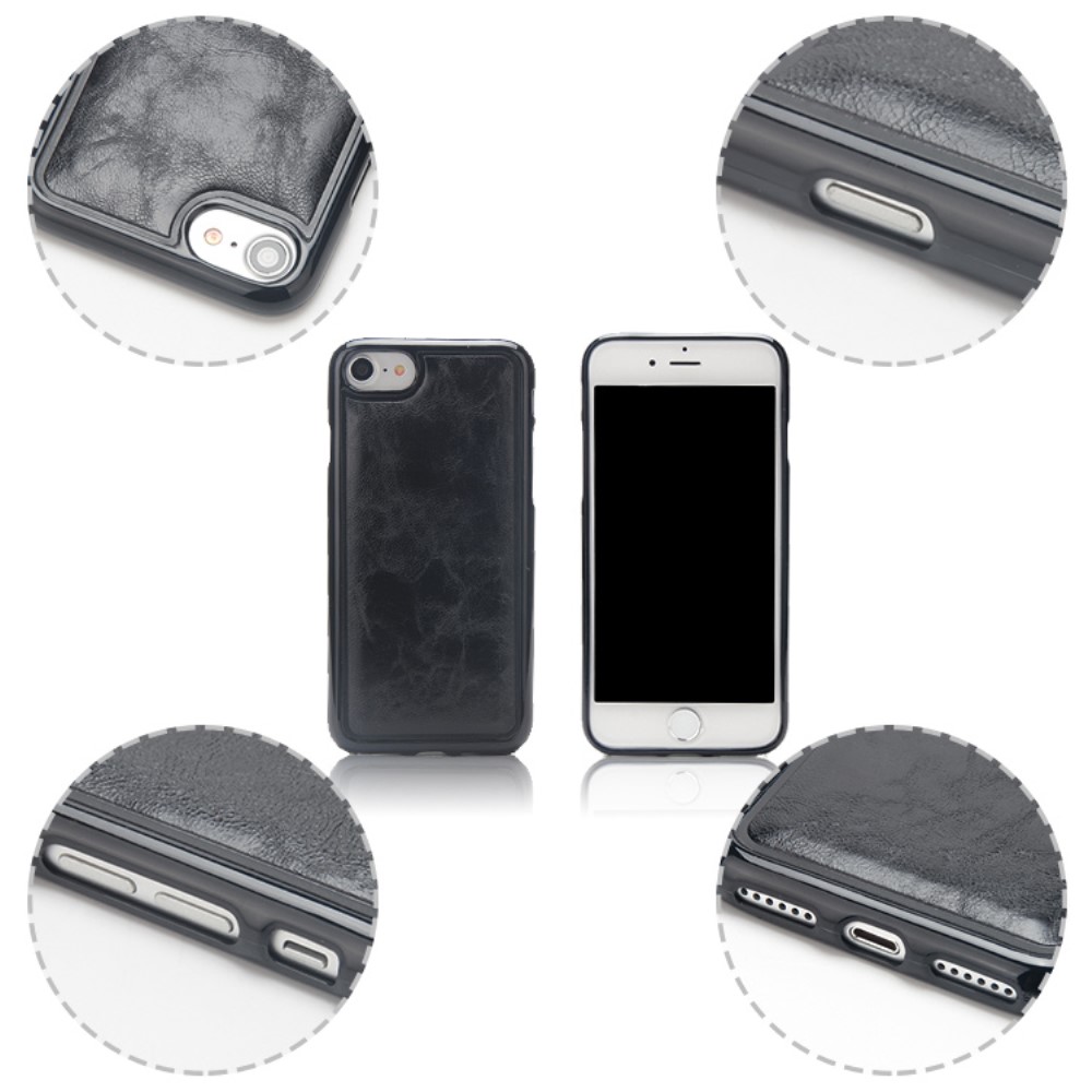 Et sort Crazy Horse adskilleligt 2-i-1 mobilcover af PU læder og pung med støttestativ og håndrem til din iPhone 7 / 8 / SE (2020) giver dig den perfekte kombination af god berøringsflade, beskyttelse og et stilrent design.