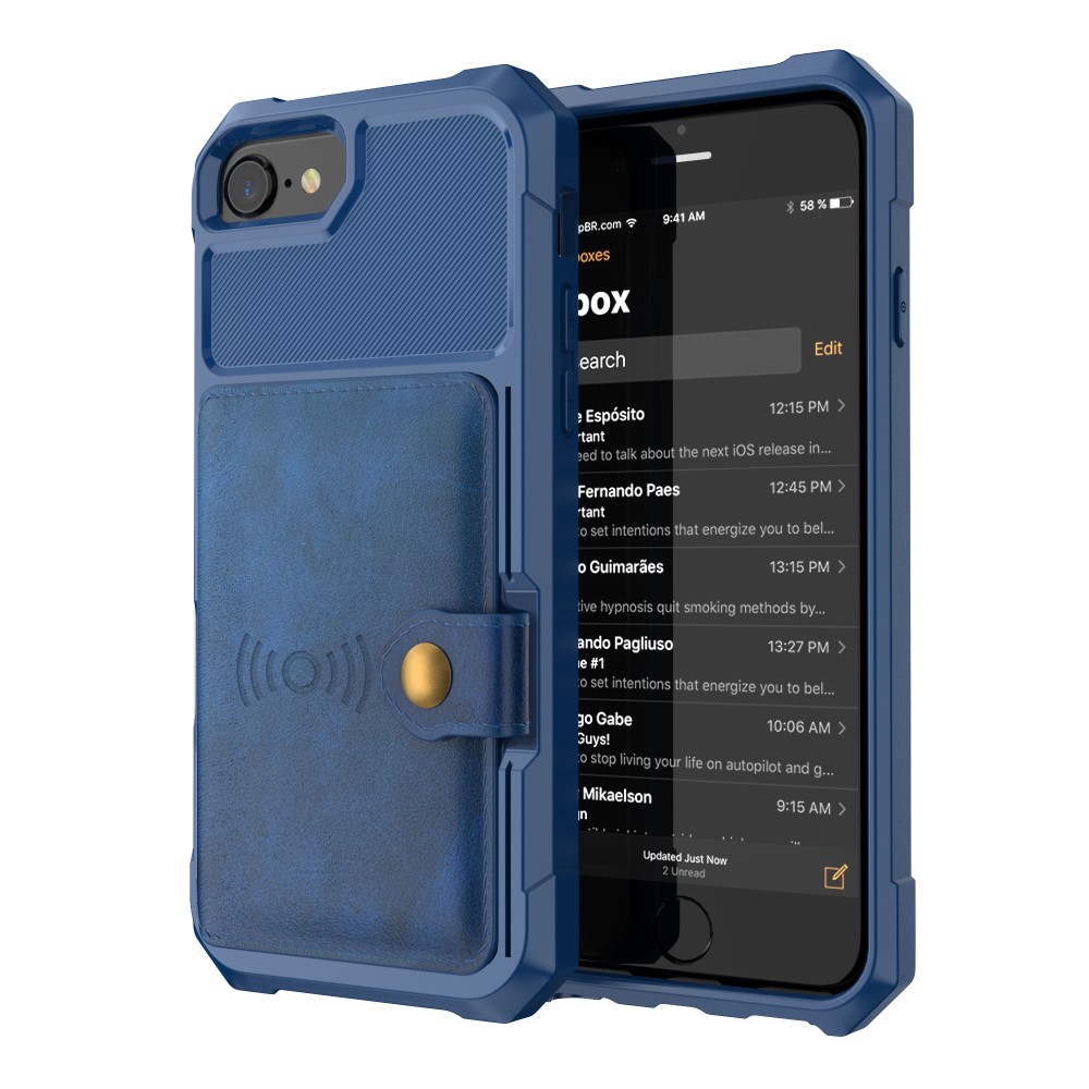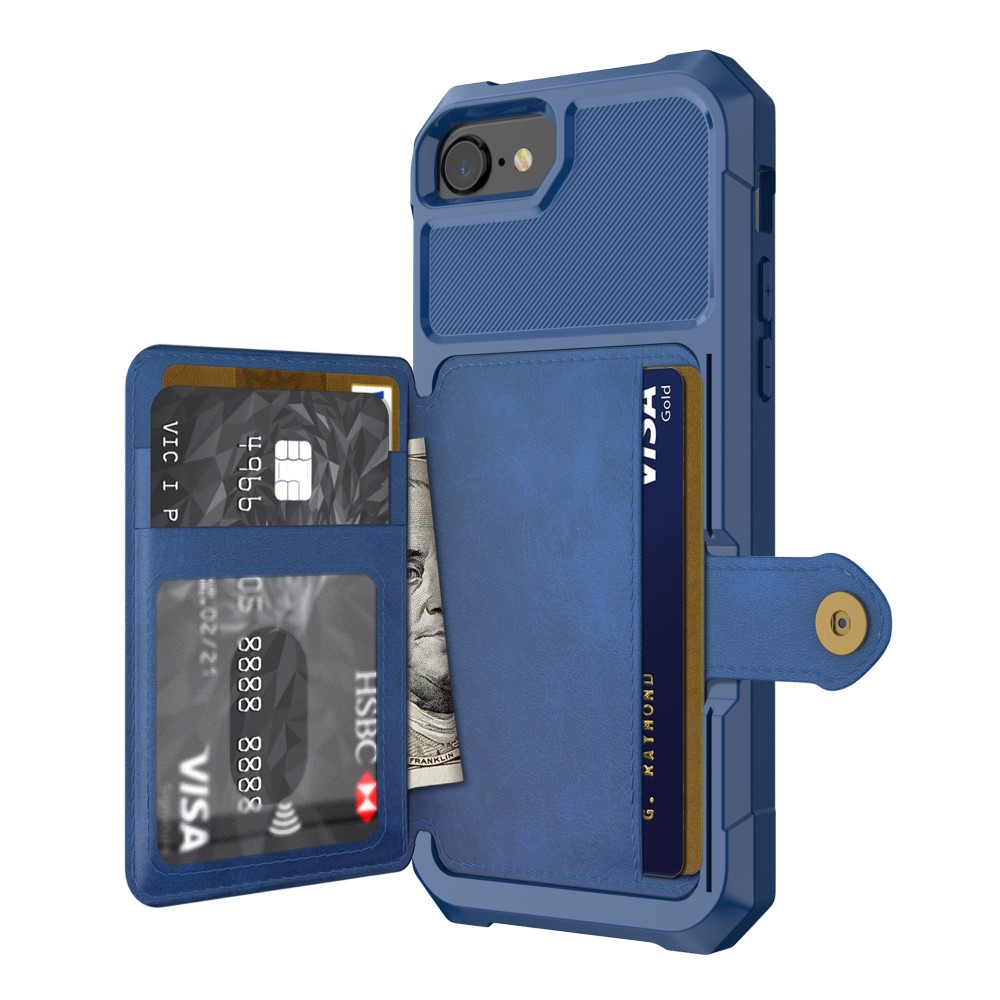 iPhone 7 / 8 / SE (2020) bagcover med magnetisk metalplade, kortholder og støttestativ – Blå