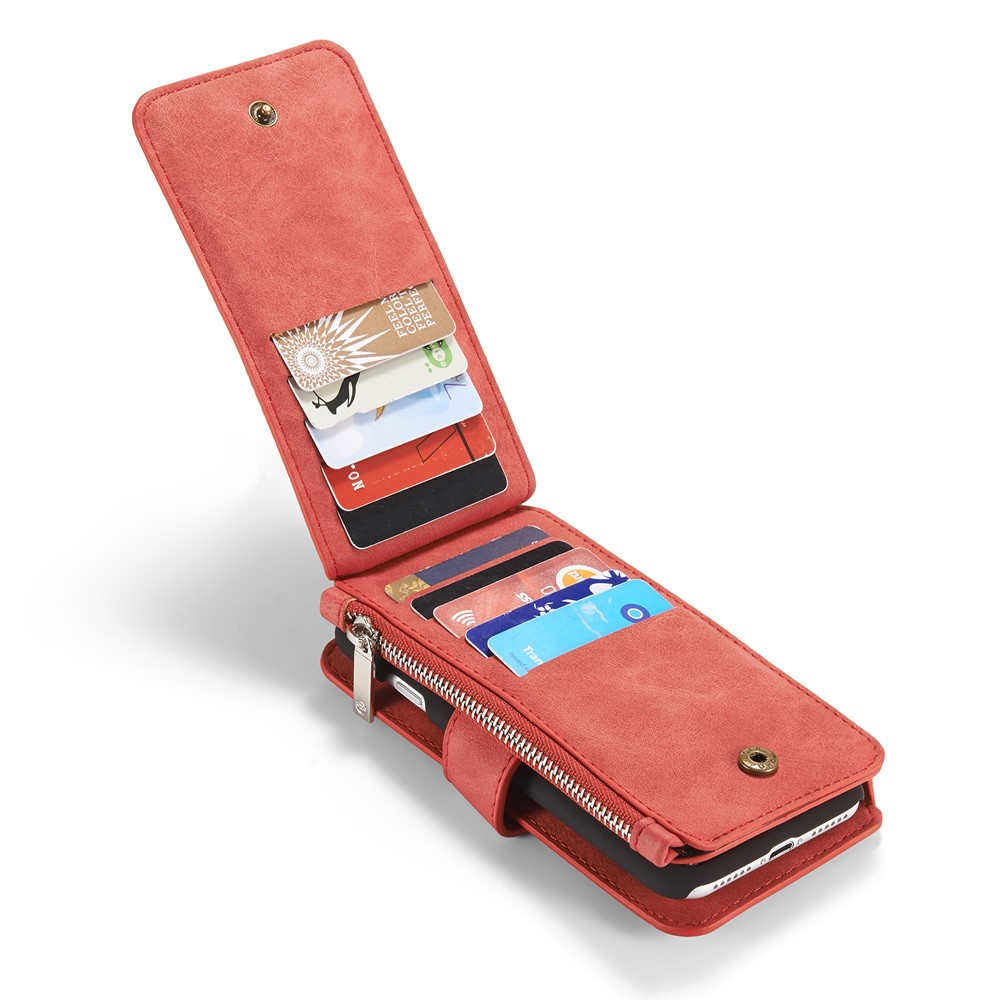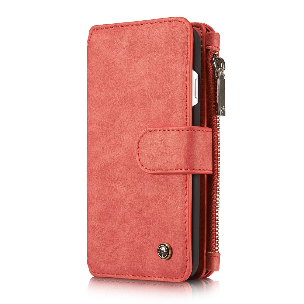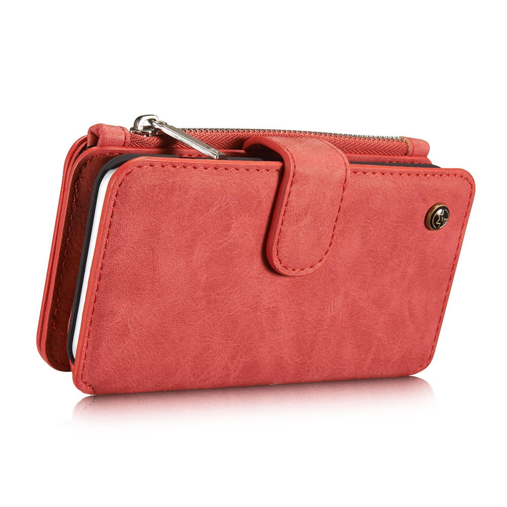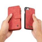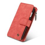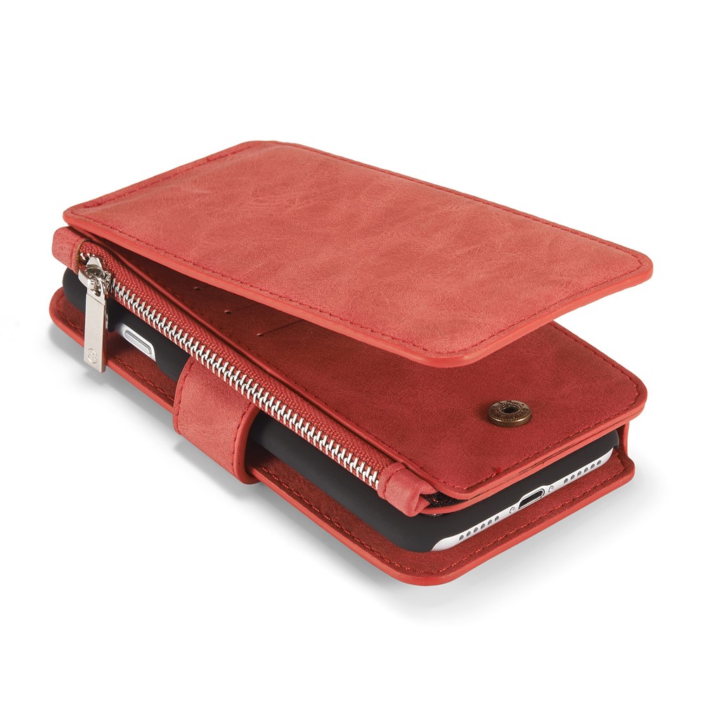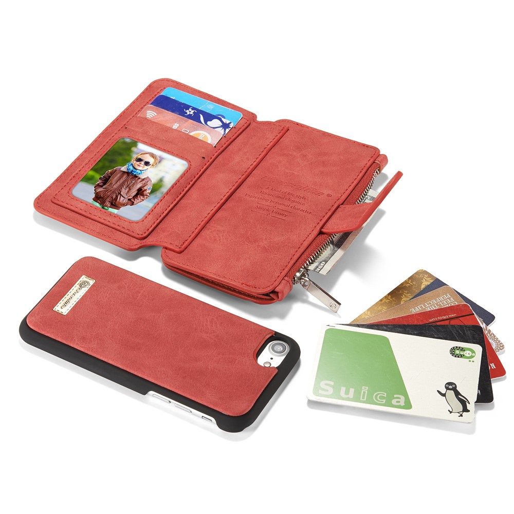 Et rødt, adskilleligt CASEME 2-i-1 mobilcover af PU læder med pung, lynlås og kortholdere til din iPhone 7 / 8 / SE (2020) giver dig den perfekte kombination af god berøringsflade, beskyttelse og et stilrent design.