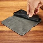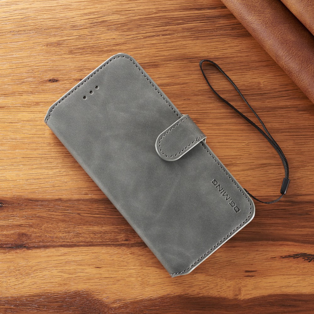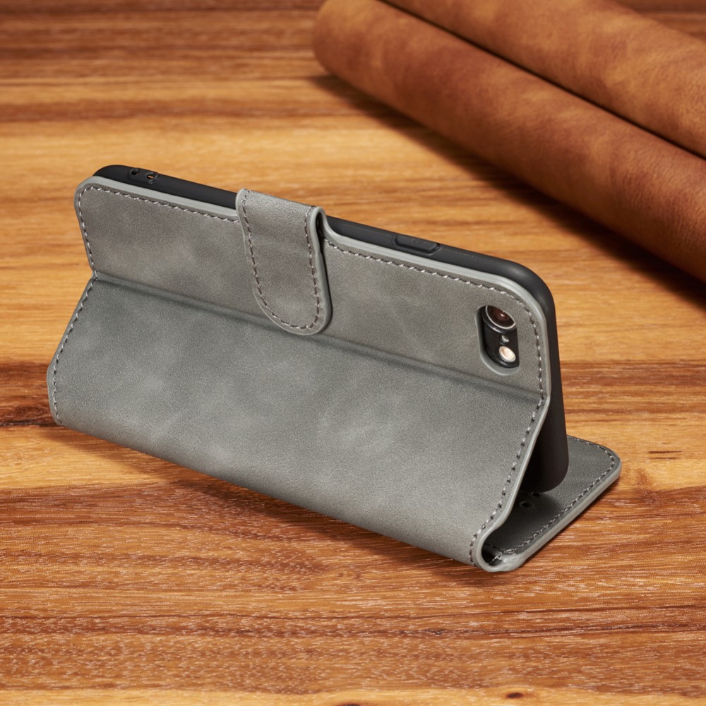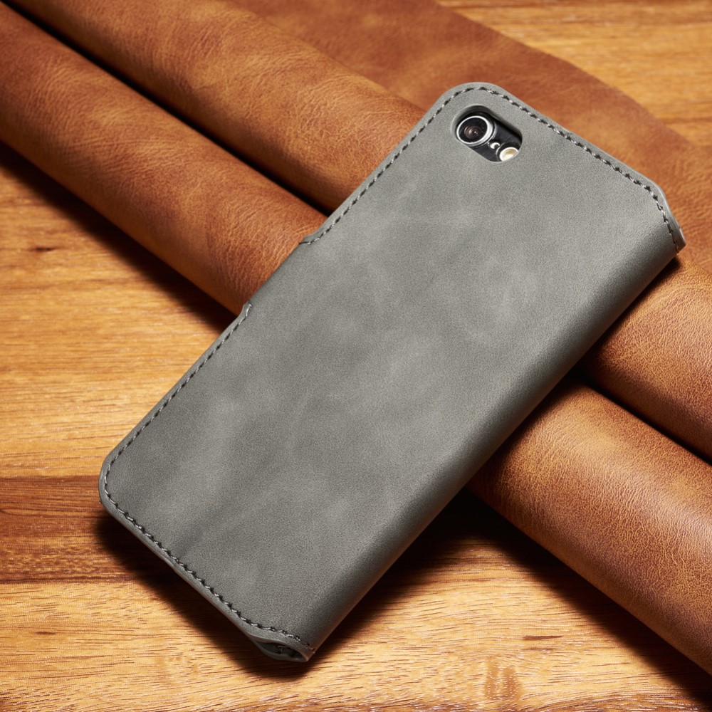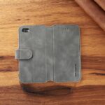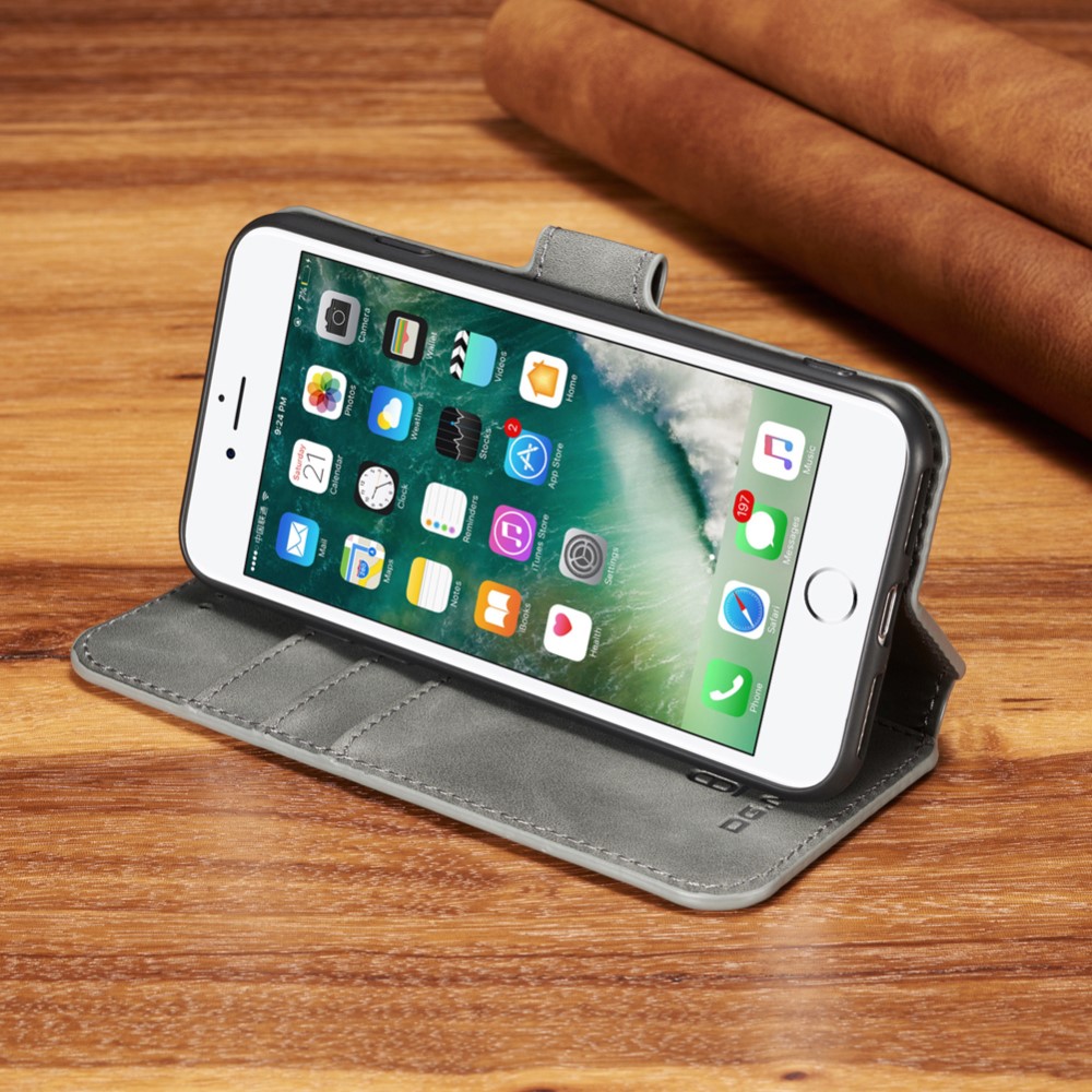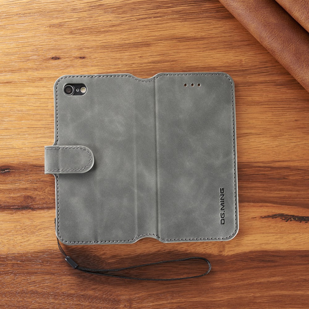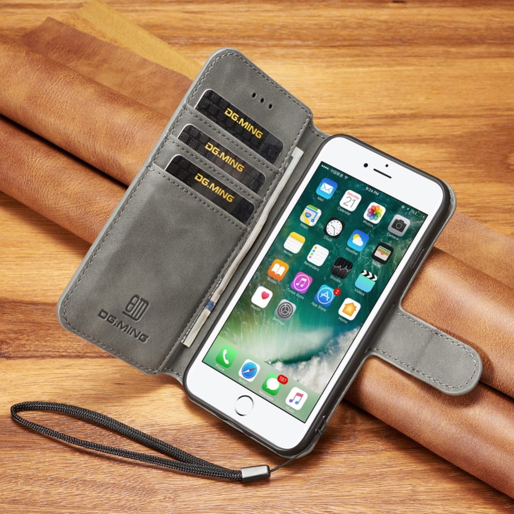 Et gråt DG.MING mobilcover af PU læder giver dig den perfekte kombination af god berøringsflade, beskyttelse og et stilrent design til din iPhone 7 / 8 / SE (2020).