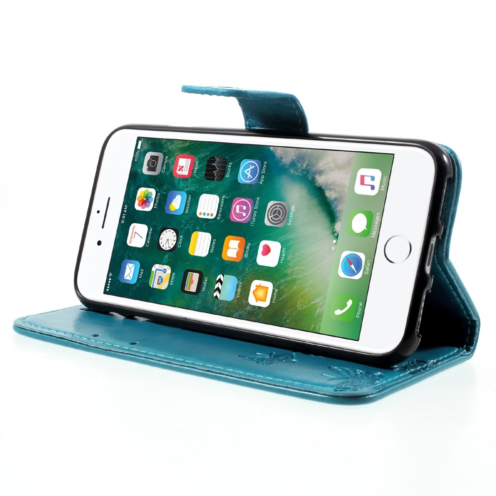 Et blåt flipcover af PU læder med sommerfugleprint samt kortholder, støttestativ og håndrem giver dig den perfekte kombination af god berøringsflade, beskyttelse og et unikt design til din iPhone 7 / 8 / SE (2020).