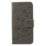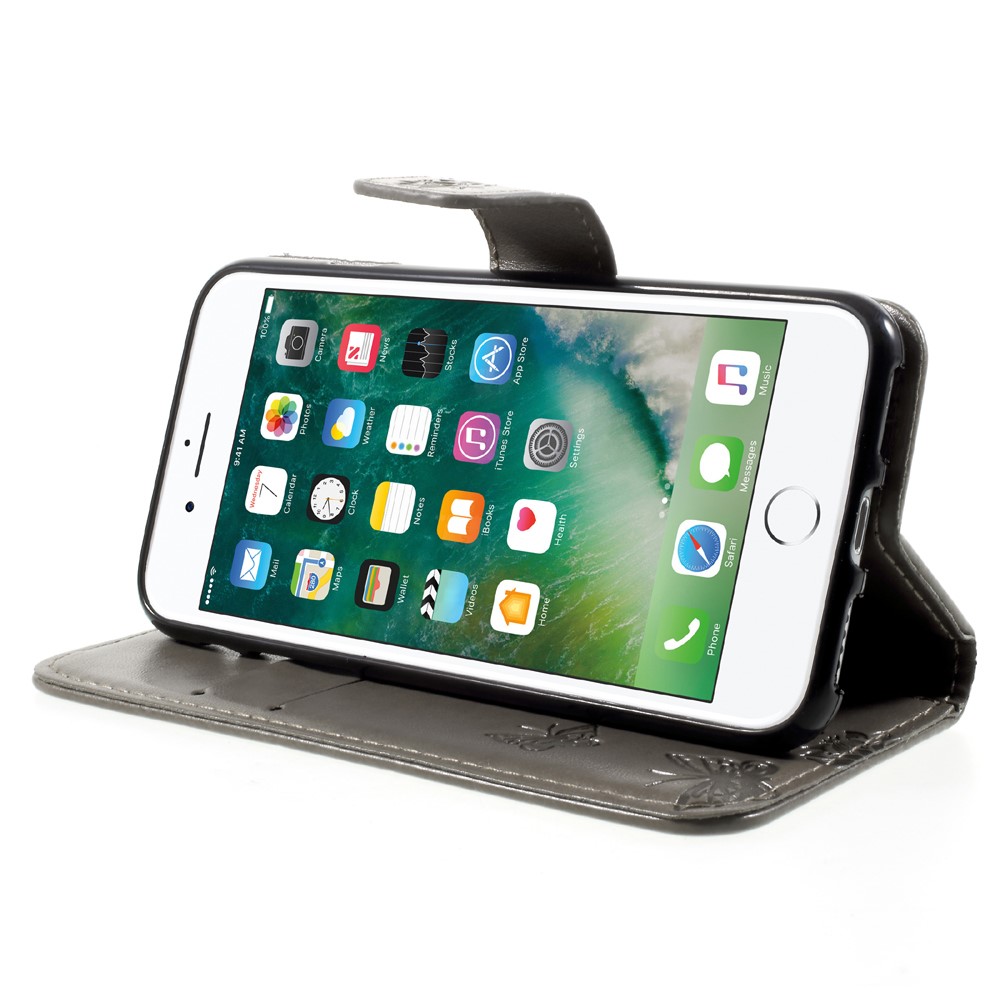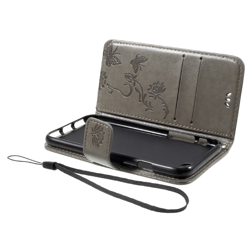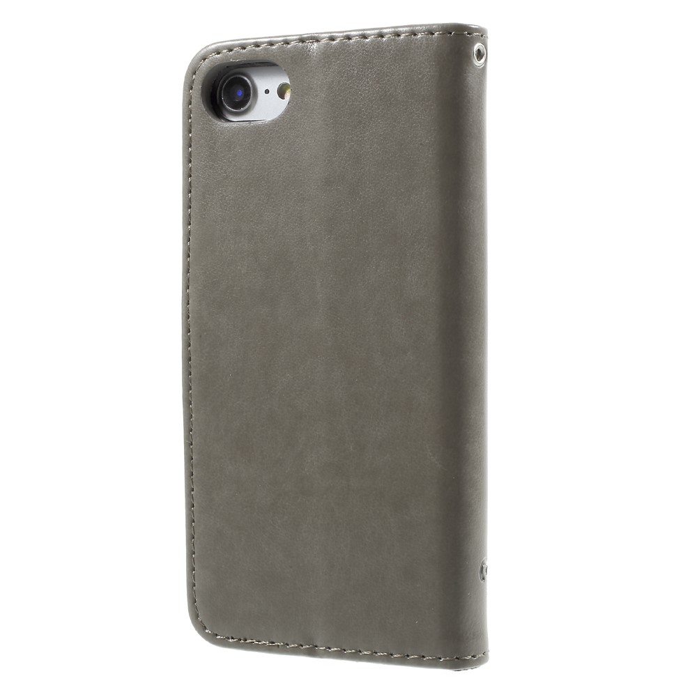 Et gråt flipcover af PU læder med sommerfugleprint samt kortholder, støttestativ og håndrem giver dig den perfekte kombination af god berøringsflade, beskyttelse og et unikt design til din iPhone 7 / 8 / SE (2020).