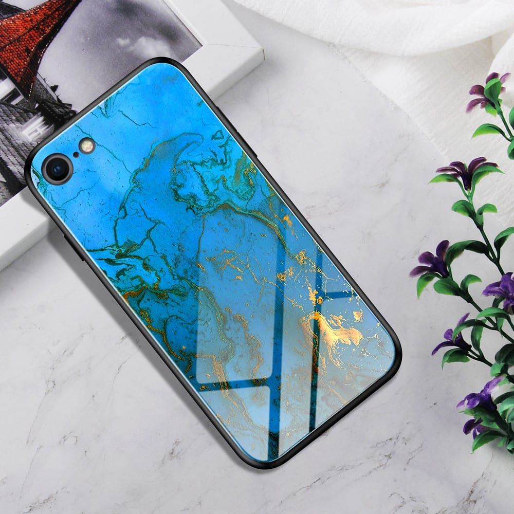 Et blå/guld hybridt mobilcover af glas til din iPhone 7 / 8 / SE (2020) giver dig den perfekte kombination af god berøringsflade, beskyttelse og et stilrent design.