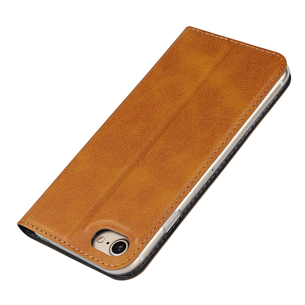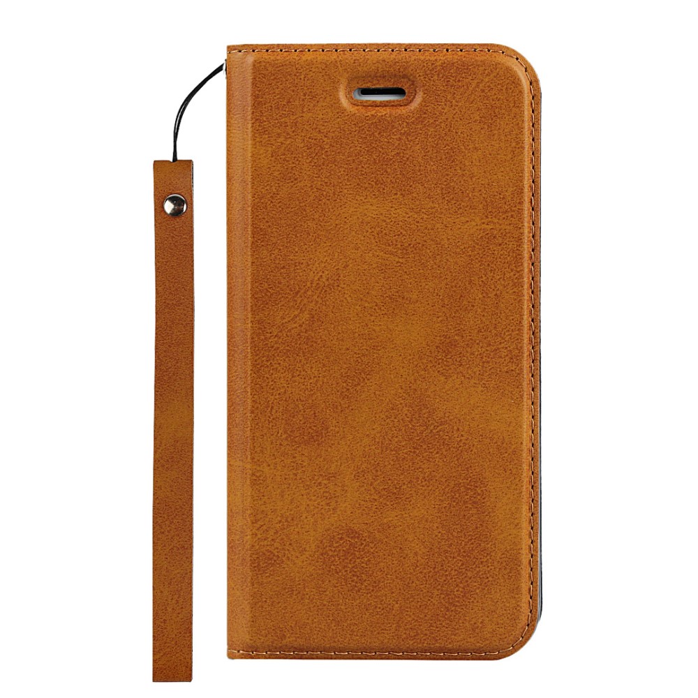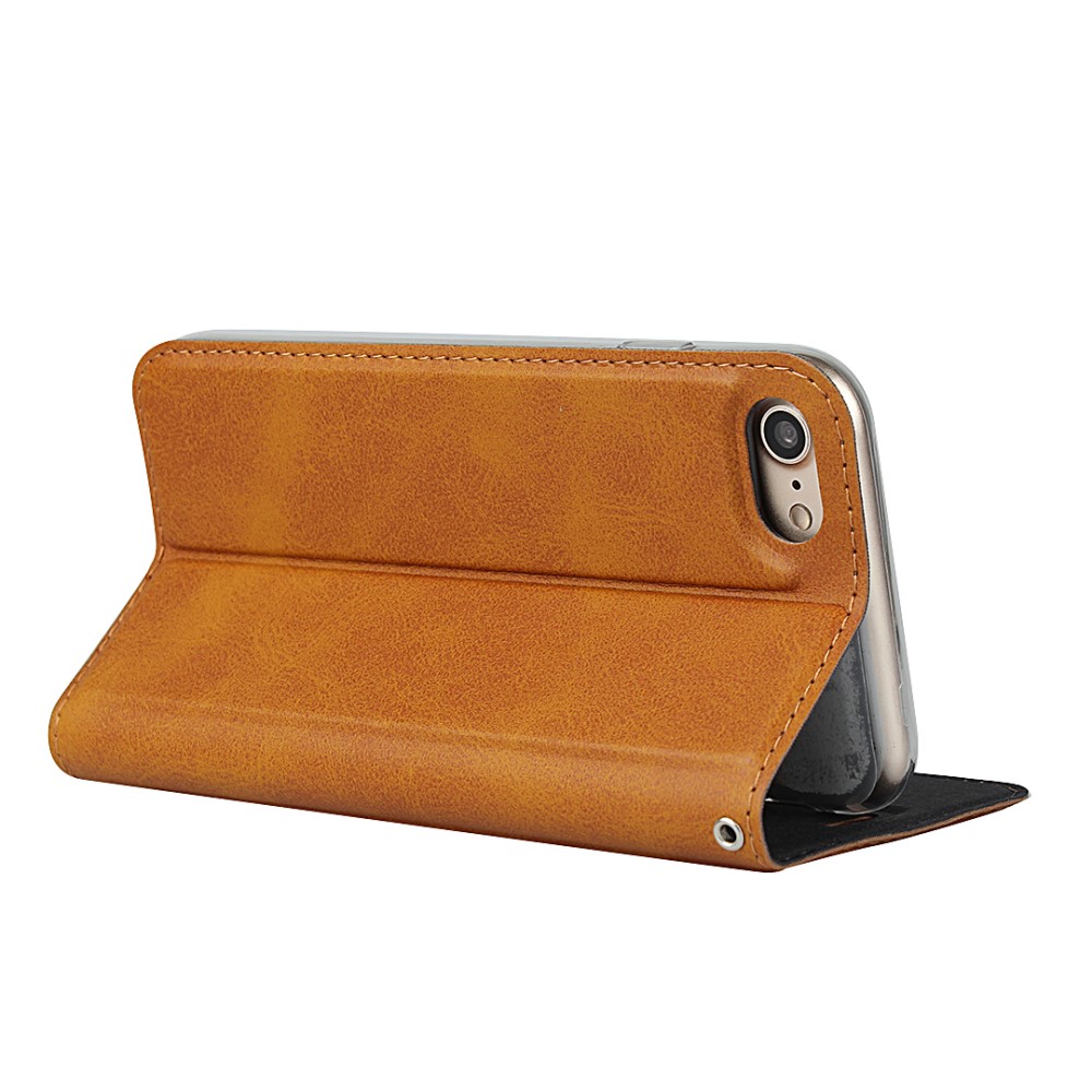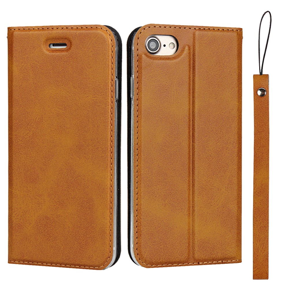 Et brunt mobilcover af PU læder med kortholder, støttestativ og håndrem til din iPhone 7 / 8 / SE (2020) giver dig den perfekte kombination af god berøringsflade, beskyttelse og et stilrent design.