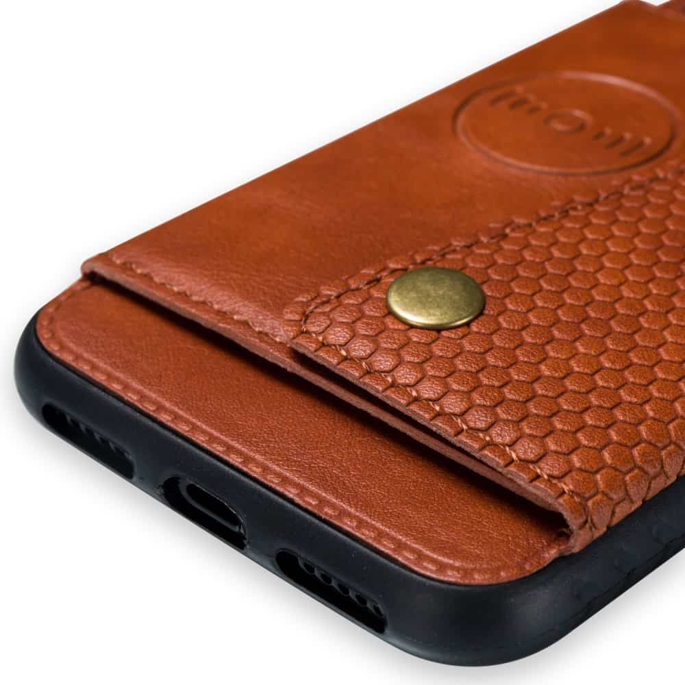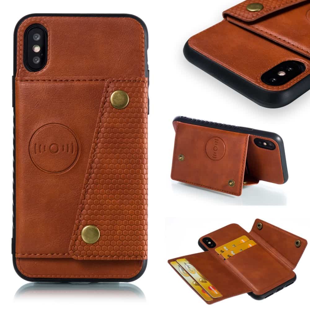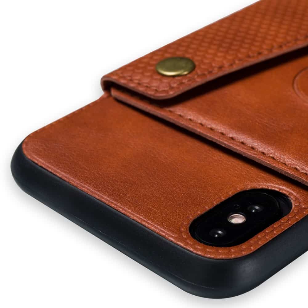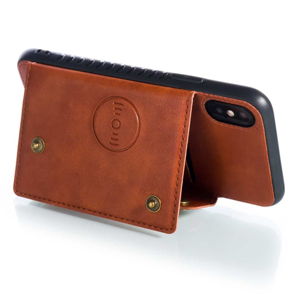 iPhone X / XS bagcover af læder og magnetisk metal med kortholder og støttestativ – Brun