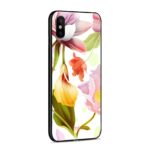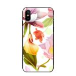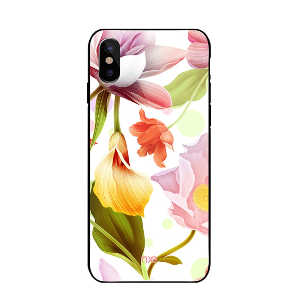 Et gult/lyserødt NXE mobilcover af hærdet glas og TPU plastik, med print af blomster til din iPhone X / XS giver dig den perfekte kombination af god berøringsflade, beskyttelse og et unikt design.