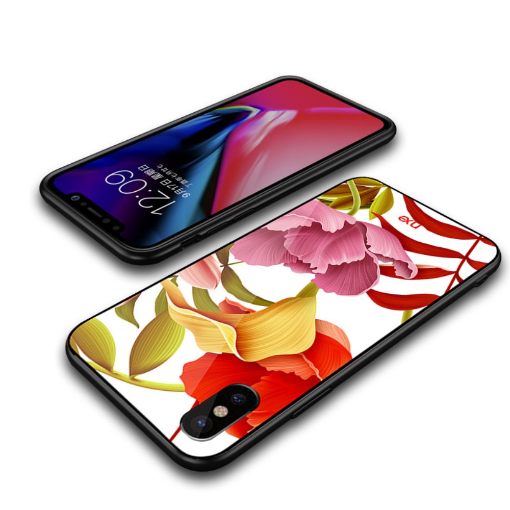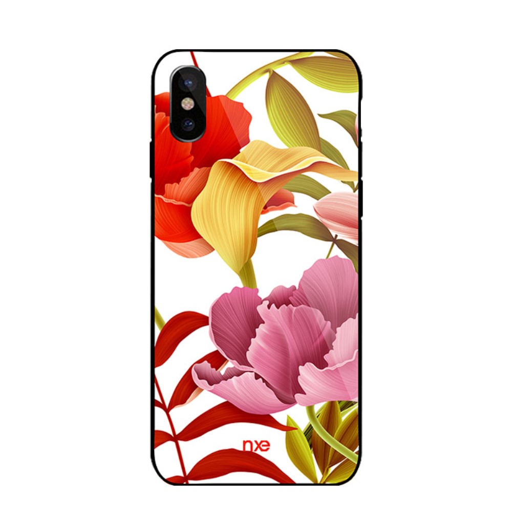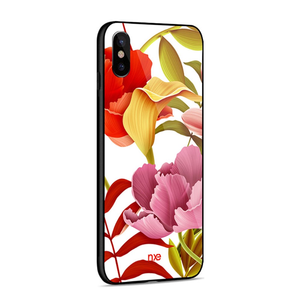 Et rødt/gult/lyserødt NXE mobilcover af hærdet glas og TPU plastik, med print af blomster til din iPhone X / XS giver dig den perfekte kombination af god berøringsflade, beskyttelse og et unikt design.