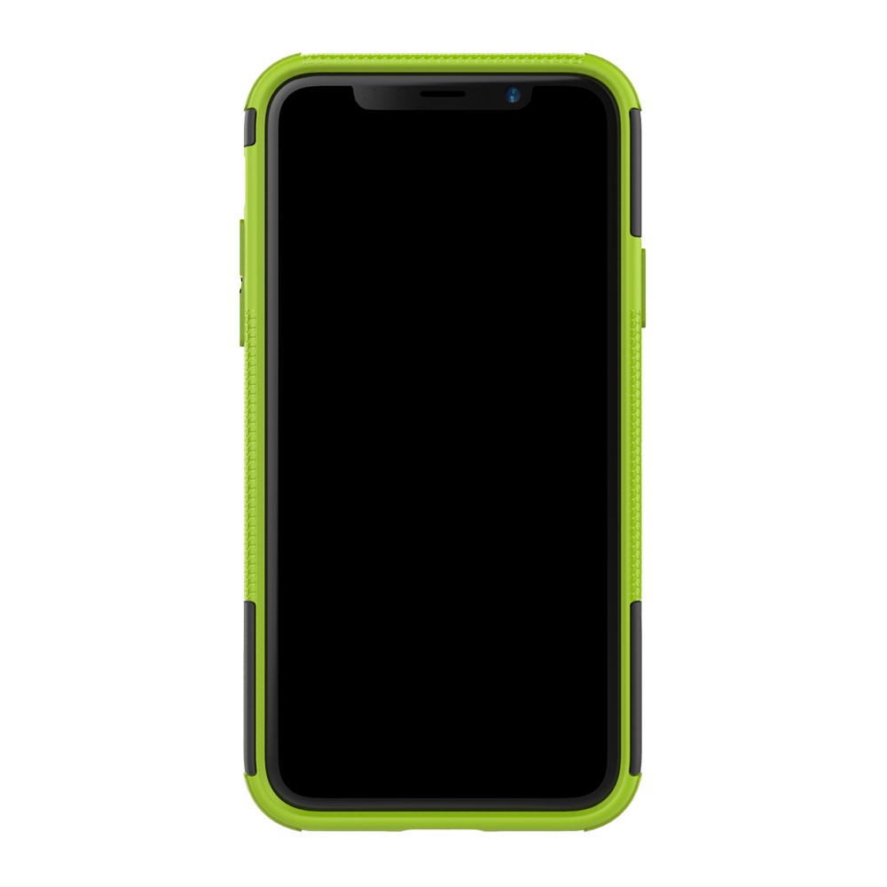 Et sort/grønt, hybridt mobilcover af solidt plastik med dækmønster og støttestativ giver dig den perfekte kombination af god berøringsflade, beskyttelse og et stilrent design til din iPhone X / XS.
