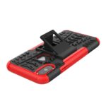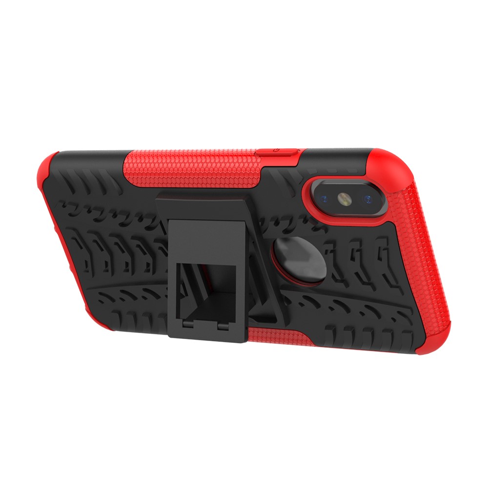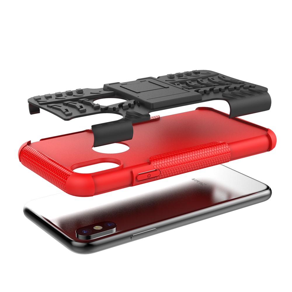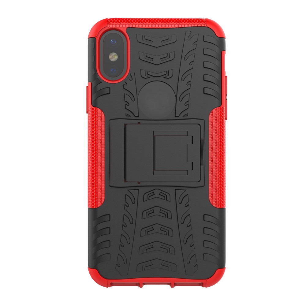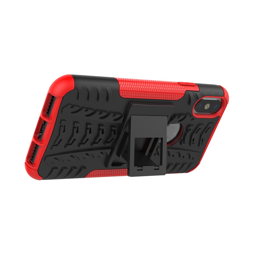 iPhone X / XS solidt bagcover med dækmønster og støttestativ – Sort/Rød