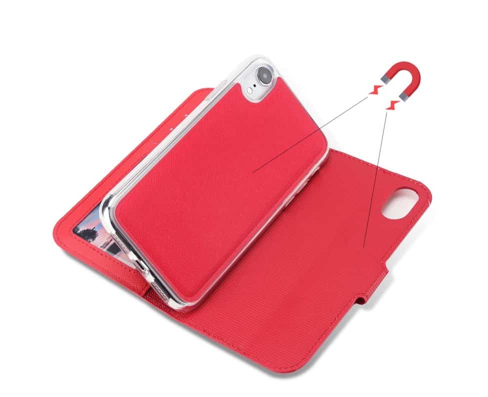 Et rødt aftageligt 2-i-1 mobilcover af PU læder med pung og håndrem til din iPhone XR giver dig den perfekte kombination af god berøringsflade, beskyttelse og et stilrent design.