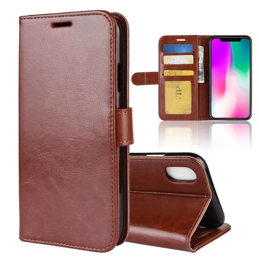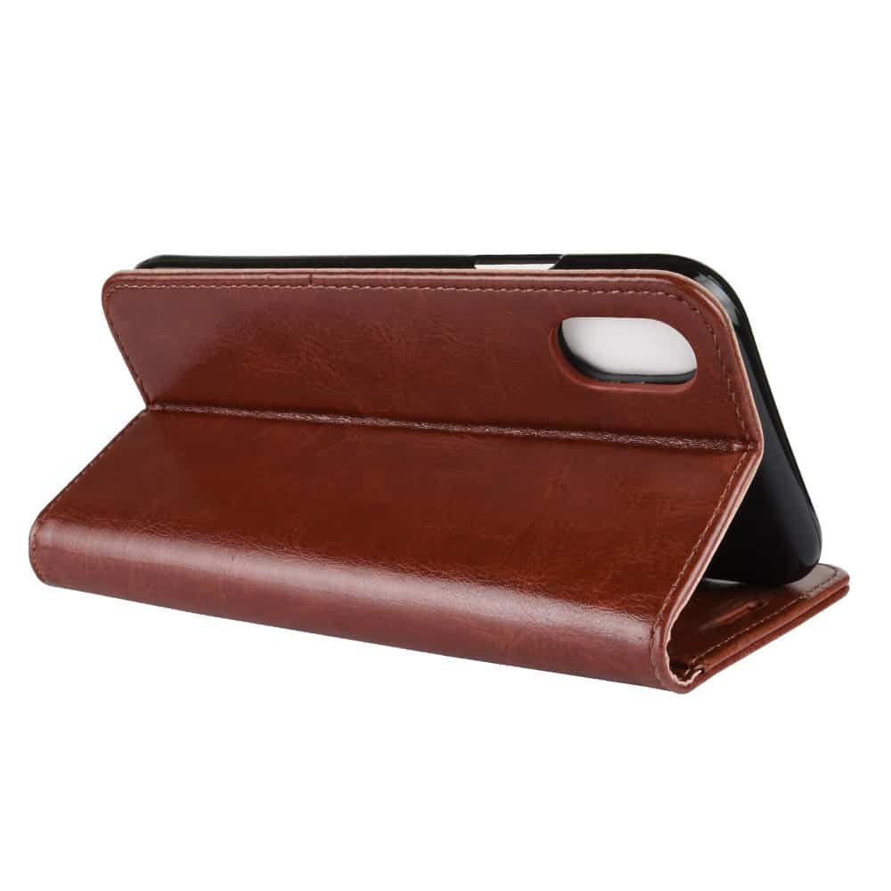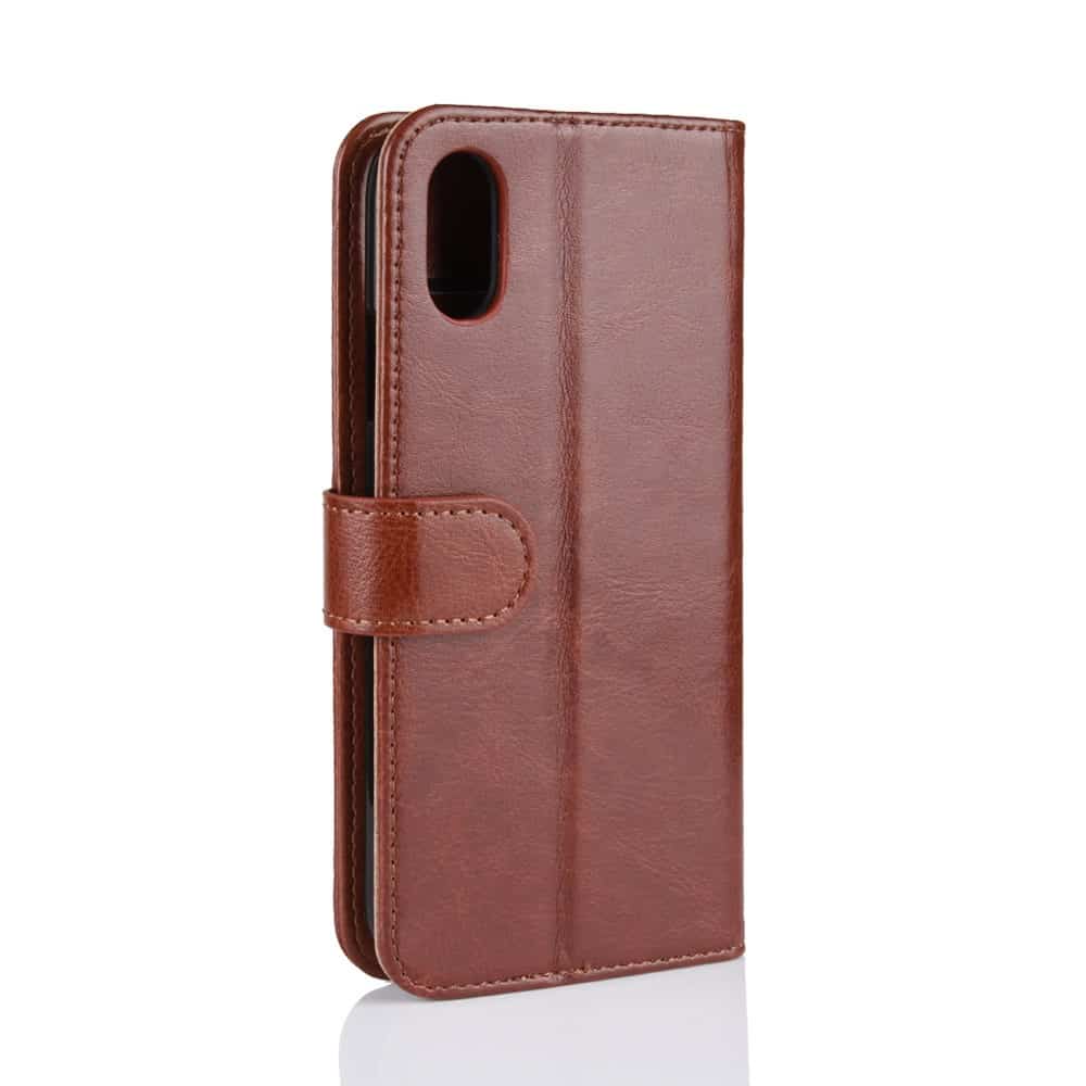 Et brunt Crazy Horse flipcover af PU læder giver dig den perfekte kombination af god berøringsflade, beskyttelse og et stilrent design til din iPhone XR.