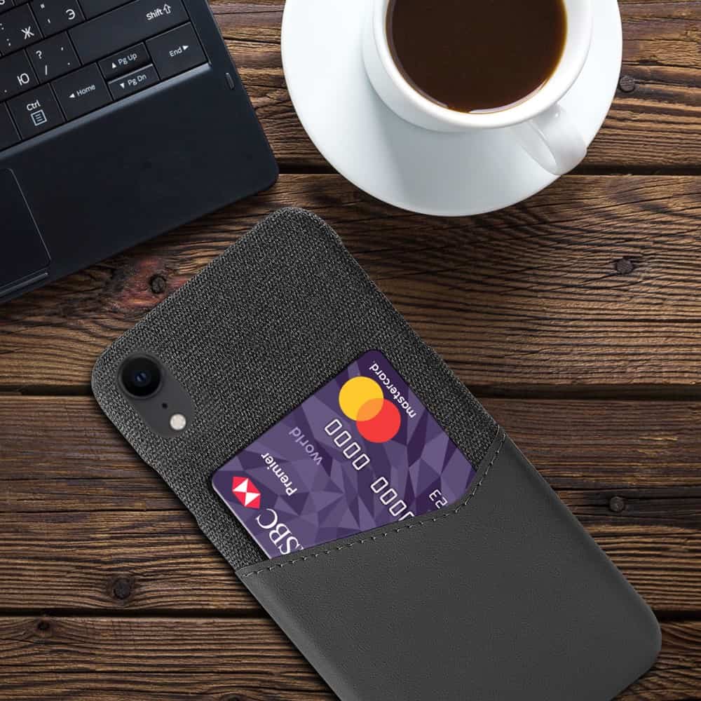iPhone XR KSQ bagcover af læder og tekstil med kortholder – Grå