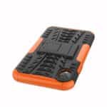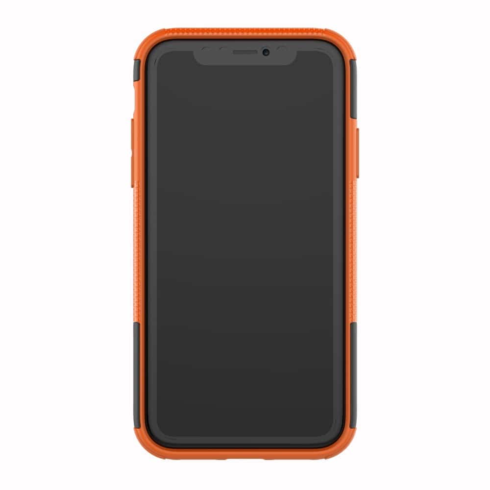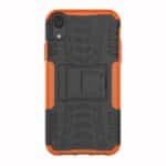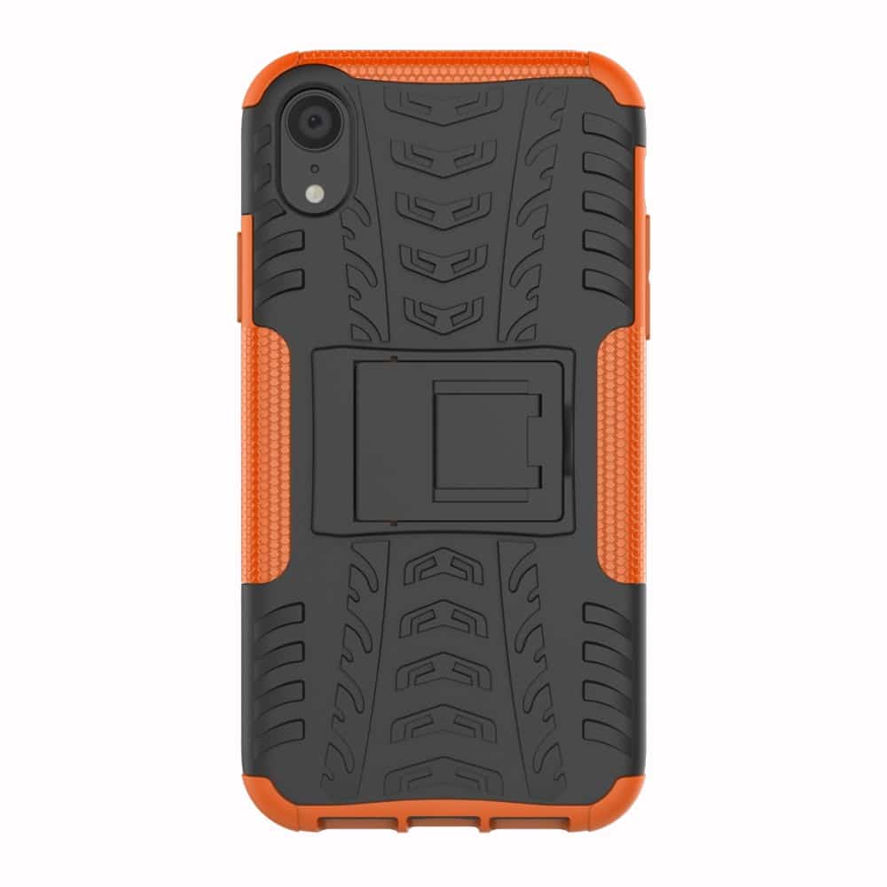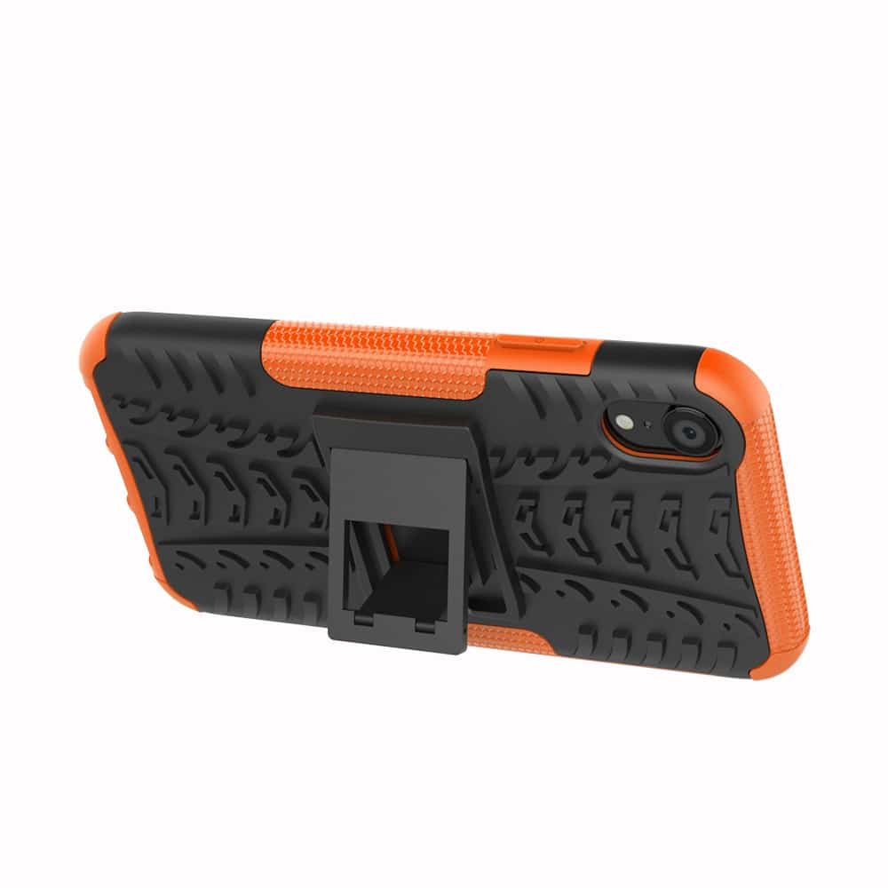 Et sort/Orange, hybridt mobilcover af solidt plastik med dækmønster og støttestativ giver dig den perfekte kombination af god berøringsflade, beskyttelse og et stilrent design til din iPhone XR.