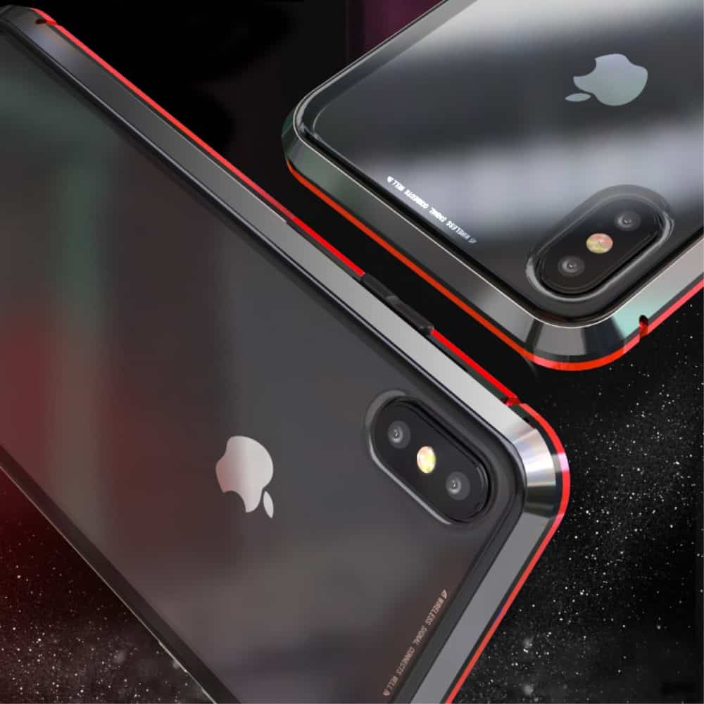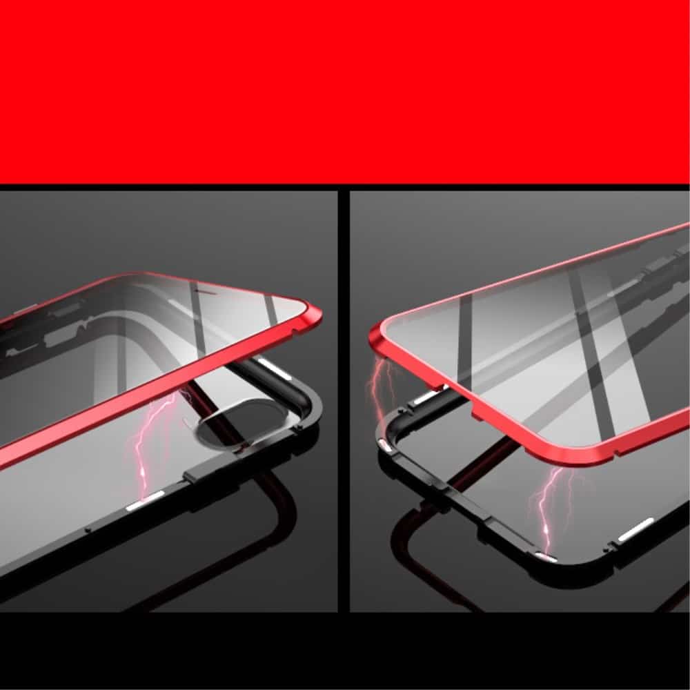 Et rødt/sort 360 graders beskyttende mobilcover af magnetisk absorberende metal med hærdet glas til din iPhone XS Max giver dig den perfekte kombination af god berøringsflade, beskyttelse og et stilrent design.