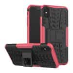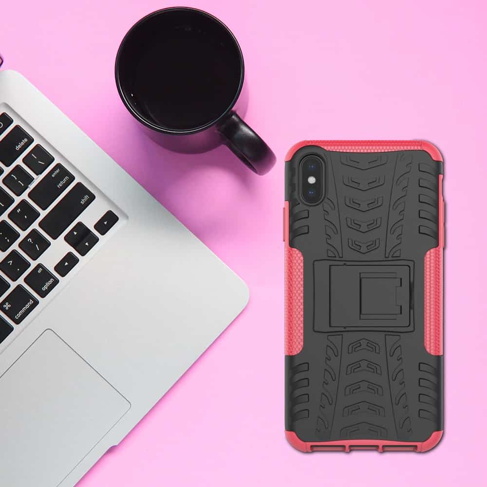 Et sort/rosa, hybridt mobilcover af solidt plastik med dækmønster og støttestativ giver dig den perfekte kombination af god berøringsflade, beskyttelse og et stilrent design til din iPhone XS Max.