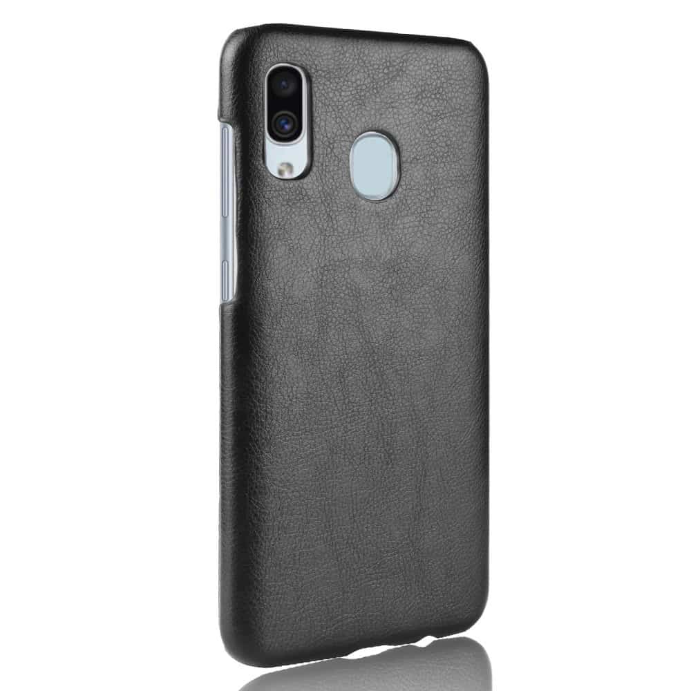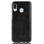 Et sort mobilcover af hårdt plastik belagt med PU læder til din Samsung Galaxy A20e giver dig en god kombination af solid beskyttelse, stor berøringsflade og et stilrent design.