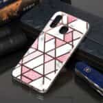 Samsung Galaxy A40 bagcover med marble mønster i blødt materiale – Hvid/Lyserød