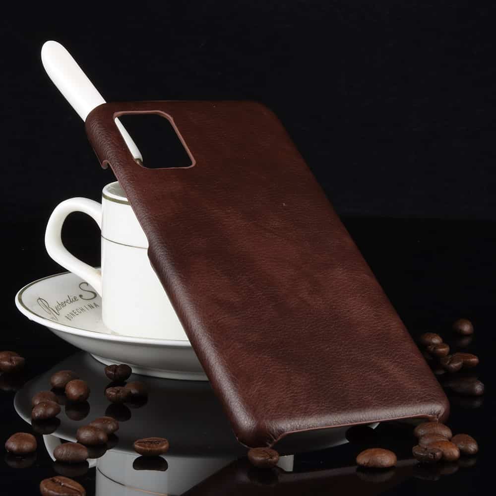 Et brunt mobilcover af hårdt plastik belagt med PU læder til din Samsung Galaxy A51 5G giver dig en god kombination af solid beskyttelse, stor berøringsflade og et stilrent design.