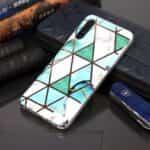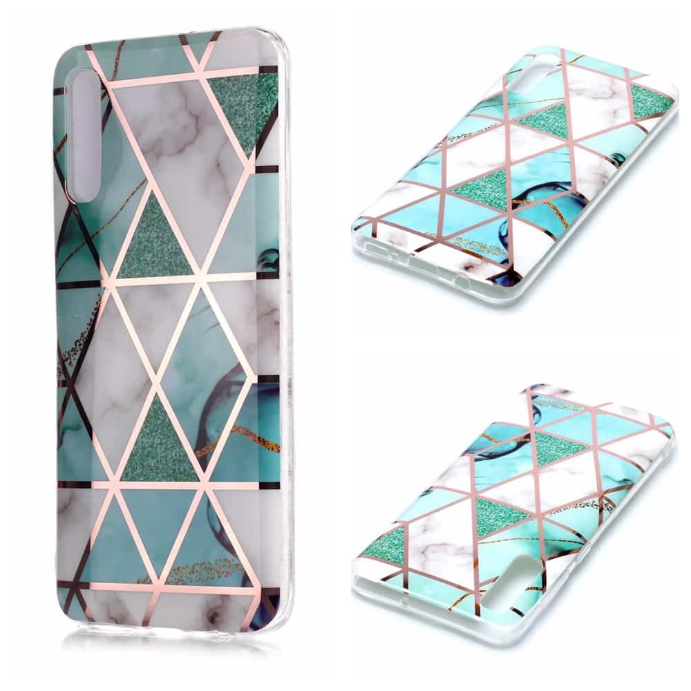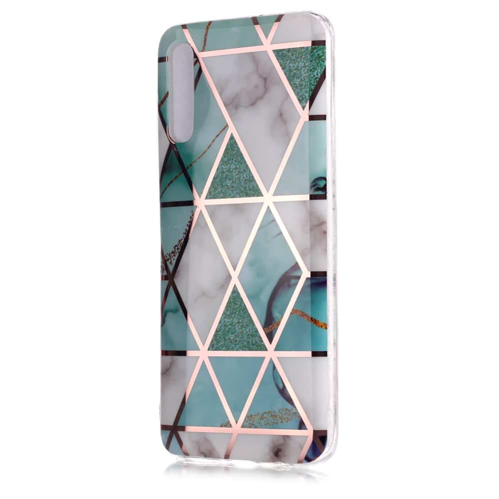 Samsung Galaxy A70 bagcover med marble mønster i blødt materiale – Hvid/Turkis
