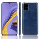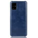 Et blåt mobilcover af hårdt plastik belagt med PU læder til din Samsung Galaxy A71 giver dig en god kombination af solid beskyttelse, stor berøringsflade og et stilrent design.